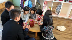4日は、ゆり組さんの茶道教室でした。お菓子をいただいた後、自分たちでたてたお茶を、お友達に飲んでもらいました。